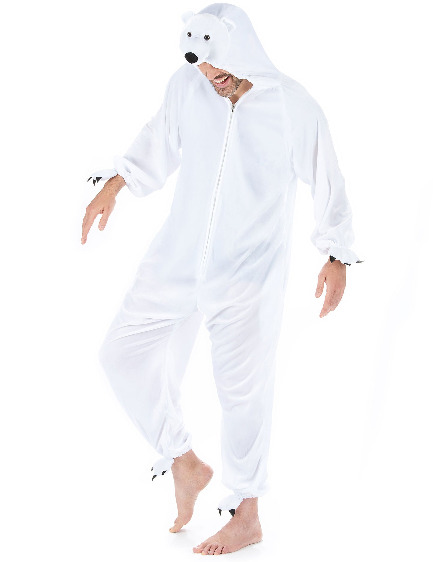 Acest costum de urs polar pentru adulți constă dintr -o combinație. Acesta este alb într -o țesătură cu efect de catifea. Gleznele și încheieturile sunt elastice și fiecare are picioare de spumă albă, cu gheare negre cusute pe ea. Există, de asemenea, o coadă albă mică în spate. Această combinație poate fi ușor filetată datorită unui fermoar prezent pe față. Acest costum va fi ideal pentru a vă face un adevărat urs polar în timpul carnavalului sau o seară deghizată.