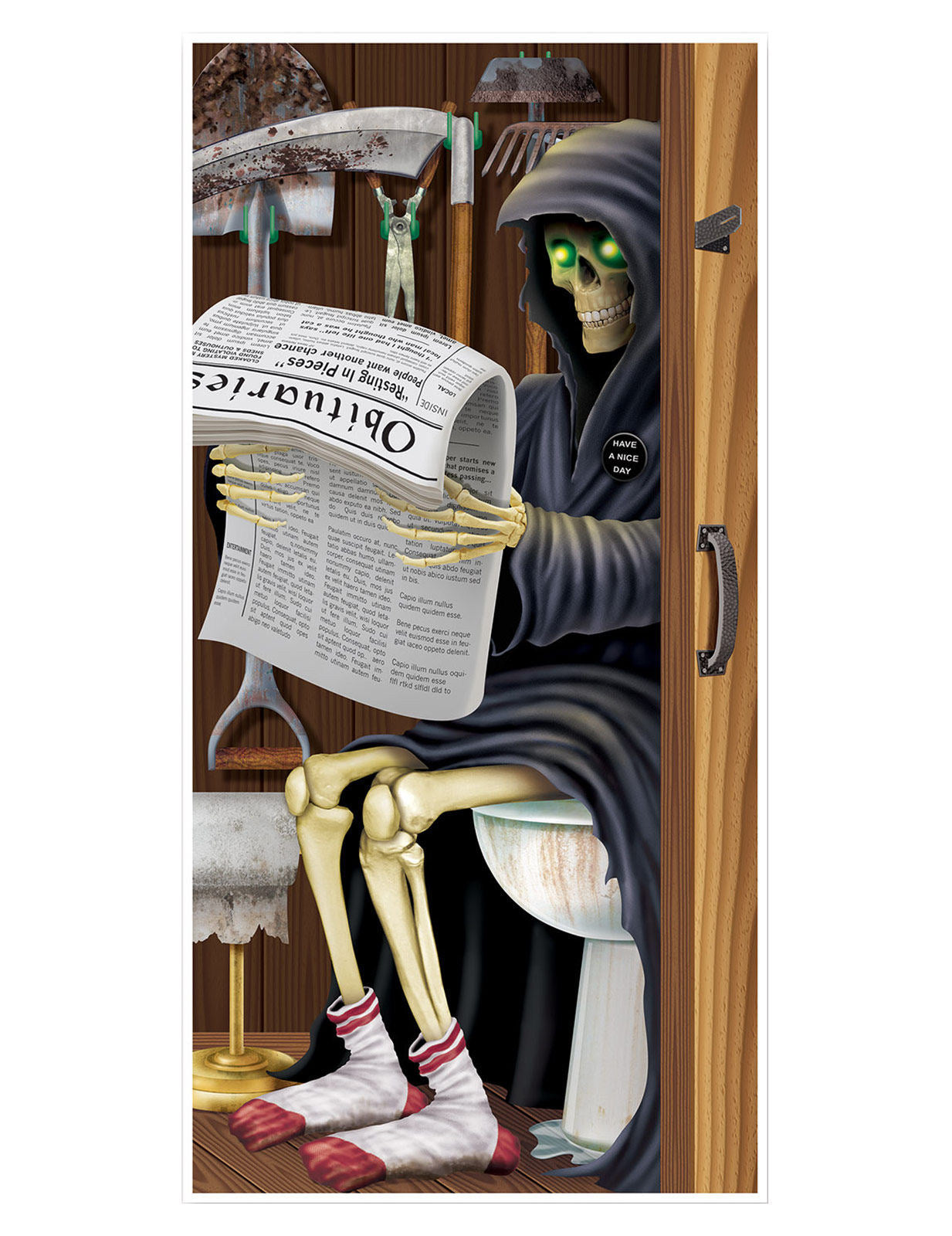 Acest poster al ușii este confecționat din plastic și măsoară aproximativ 76 x 152 cm. Reprezintă o cositoare mare cu falsa ei, stând pe toaletă în timp ce îi citea ziarul. Un poster amuzant pe care nu l -ai mai văzut niciodată! Cu această decorare a ușilor de Halloween, oaspeții dvs. vor avea imediat gâscă de gâscă!