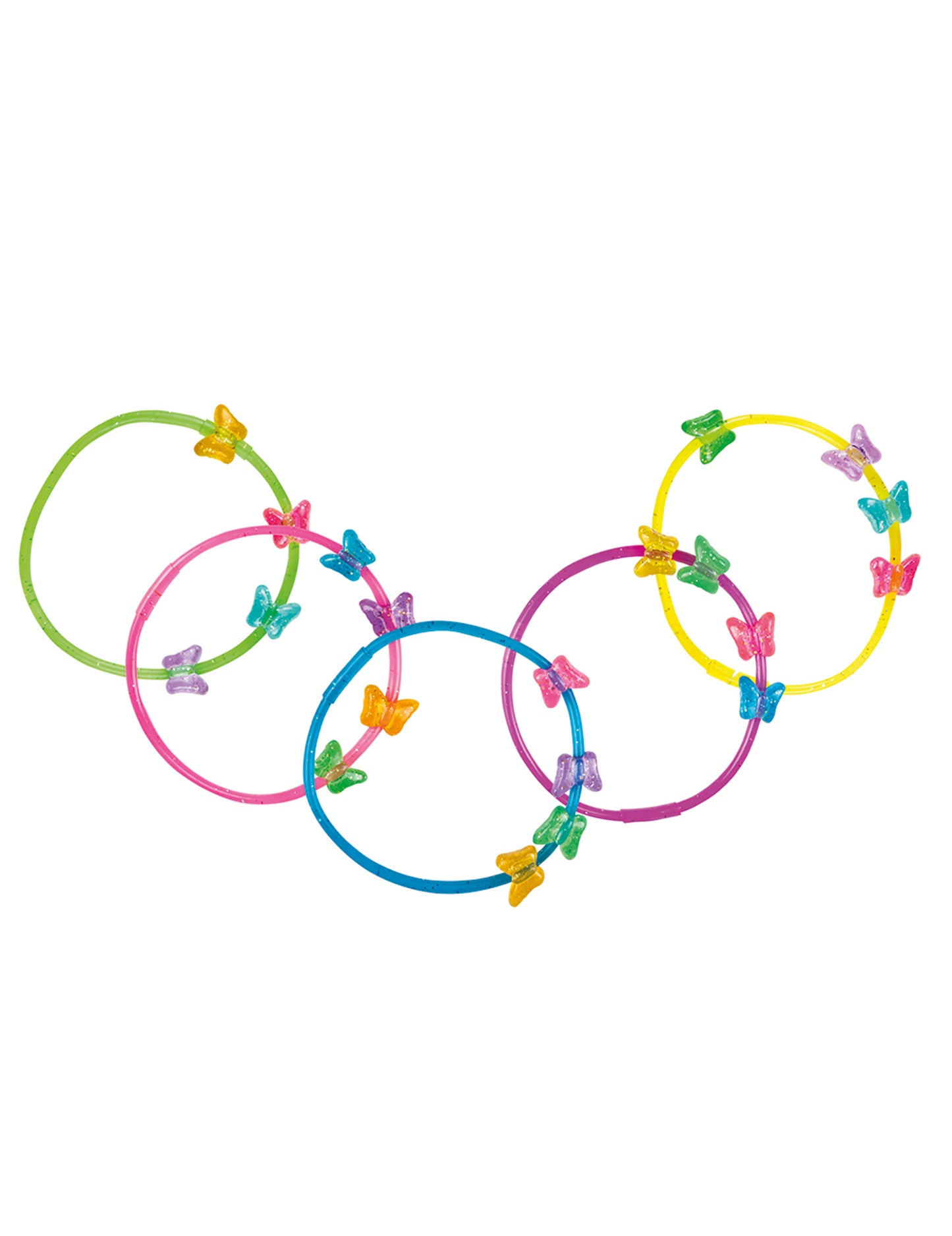 Aceste 5 brățări flexibile sunt oferite în culoarea pericolului. Sunt confecționate din plastic și prezintă perle în formă de fluturi cu sclipici. Aceste mici bijuterii de costum vor fi cadouri perfecte pentru ziua de naștere a fiicei tale, de exemplu!
