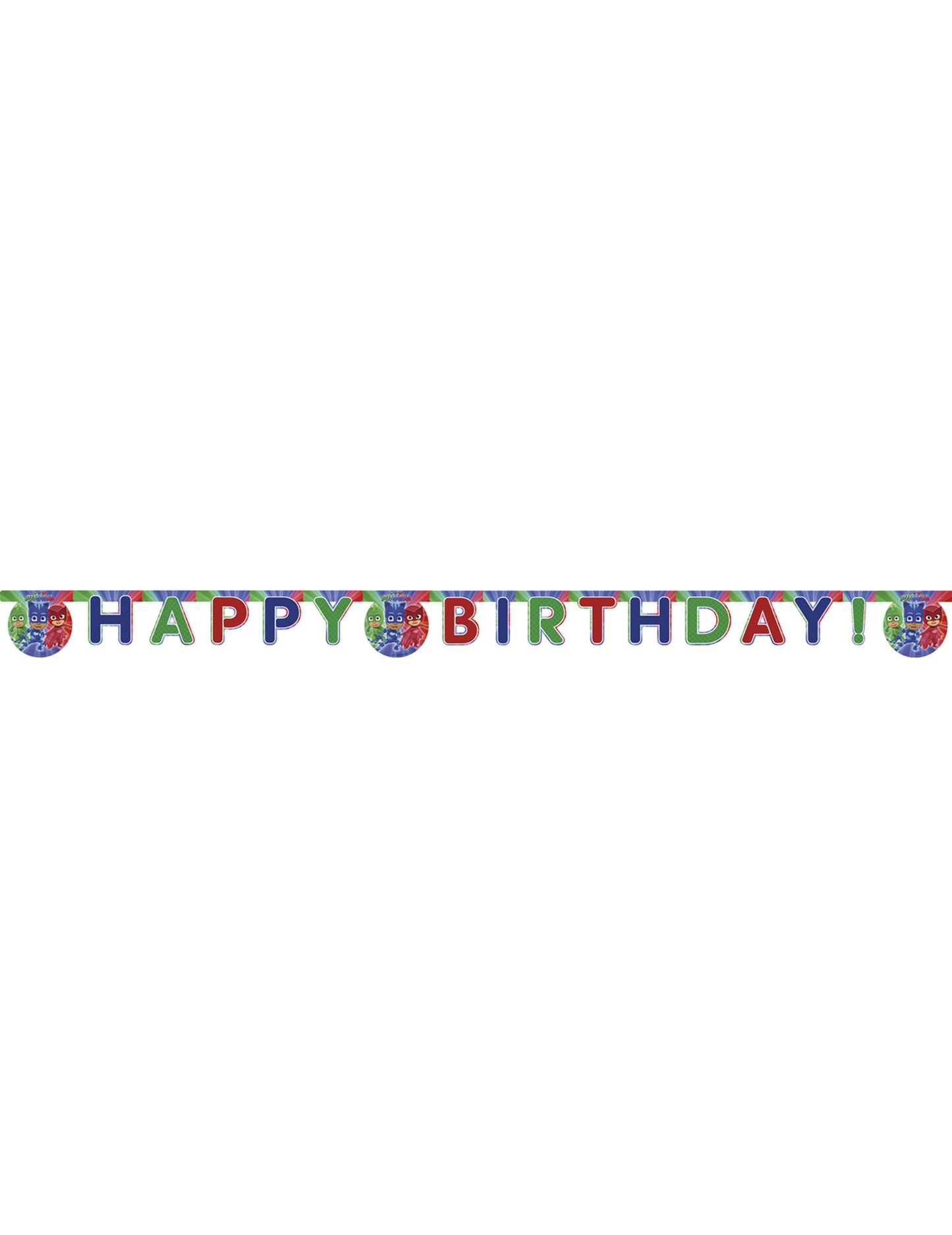Această ghirlandă de naștere este sub pijamasque oficială. Are o lungime de aproximativ 2 metri și este format din autocolante de carton, precum și litere de carton colorate care formează mesajul „La mulți ani”. Culorile sunt roșii, verzi și albastre. Ele reprezintă culorile ținutelor de pijamasque. Vignetele sunt decorate cu personaje de desene animate: Bibou, Yoyo și Gluglu. Puteți suspenda cu ușurință ghirlanda de șirurile furnizate pe capete. Această ghirlandă va fi perfectă pentru decorarea camerei dvs. cu ocazia zilei de naștere a copilului dvs.!