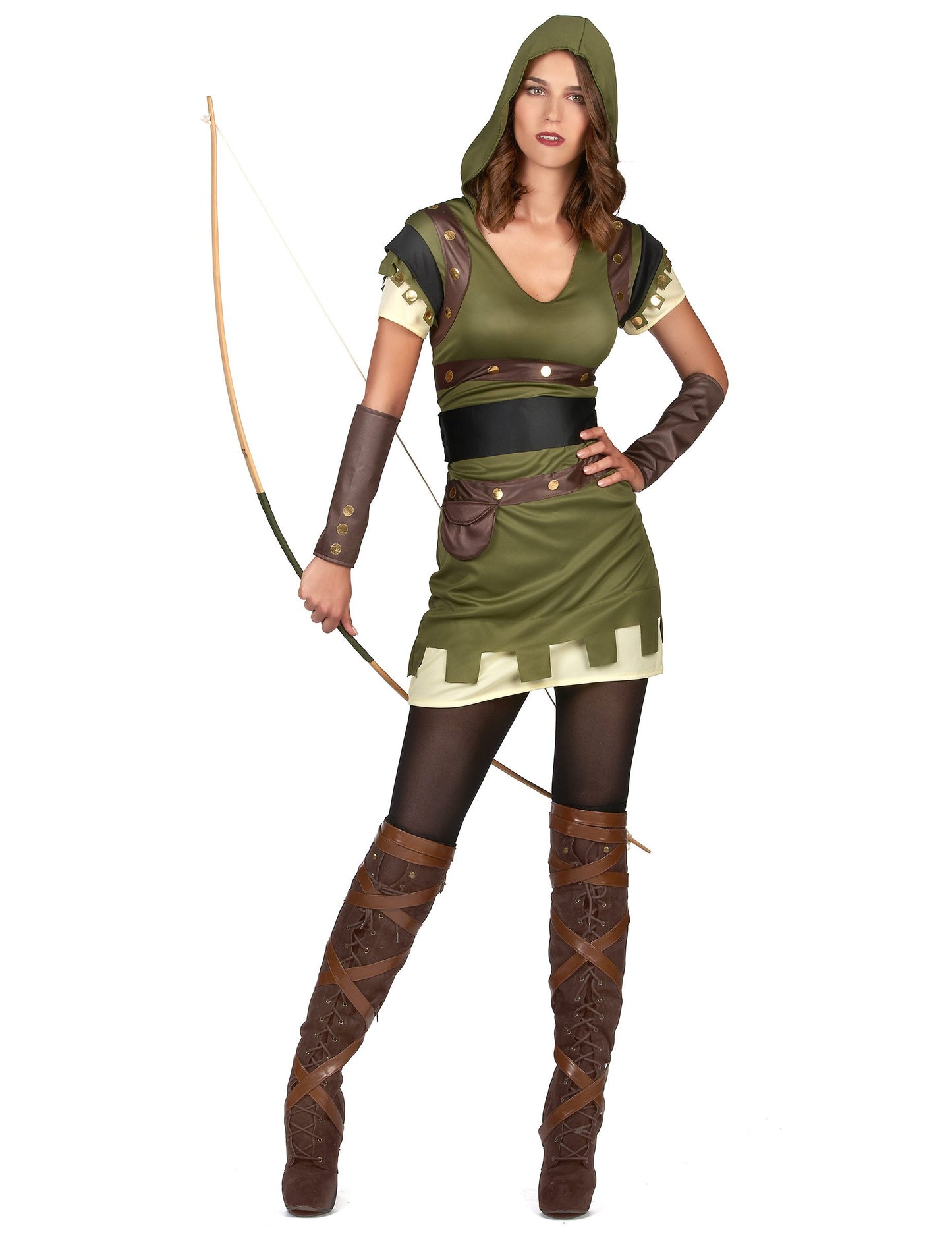 Acest costum de arcaș din lemn pentru femei este format dintr -o rochie cu curea și o pereche de manșete (arc, colanți și cizme pe care le includem). Rochia în tonuri verzi kaki are un guler „V” și mâneci scurte. Este decorat cu o centură neagră cusută la talie și două benzi maro și largi care înconjoară această centură neagră. Aceleași trupe maro sunt prezente și la mânecile acestei rochii. Manșetele maro sunt, de asemenea, prezente pentru a -ți completa costumul de lemn. Acest costum va fi perfect pentru a întruchipa un arcaș cu ocazia carnavalului sau a unei petreceri deghizate!