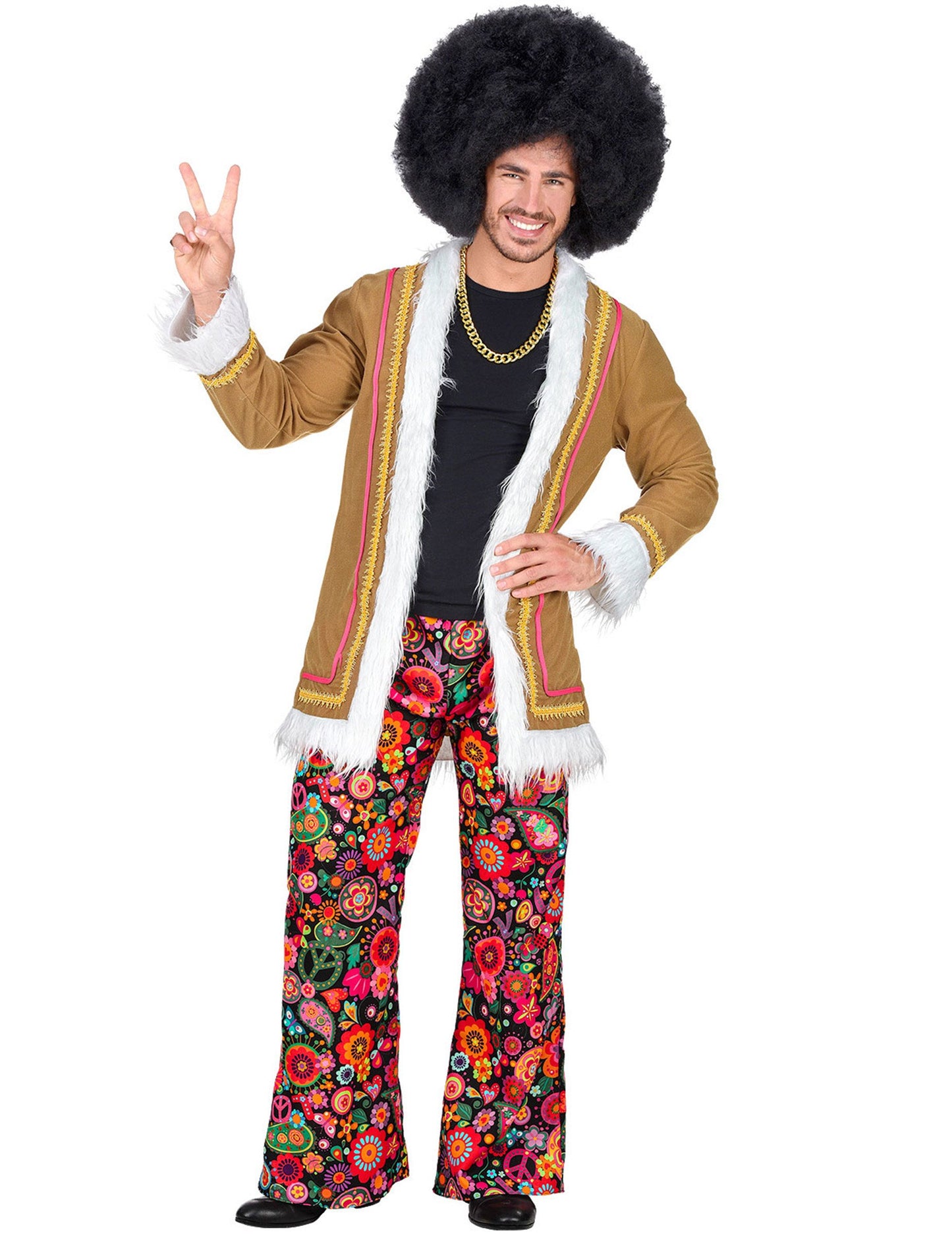 Această deghizare hippie pentru bărbați este formată dintr -o geacă și pantaloni. Jacheta are culoare de nisip, cu blană faux alb pe margini. Este decorat cu marginea roz și galben. Pantalonii evazați sunt imprimați cu modele colorate pe un fundal negru. Acest costum va fi perfect pentru a -l juca pe Hippie în timpul unei seri deghizate.