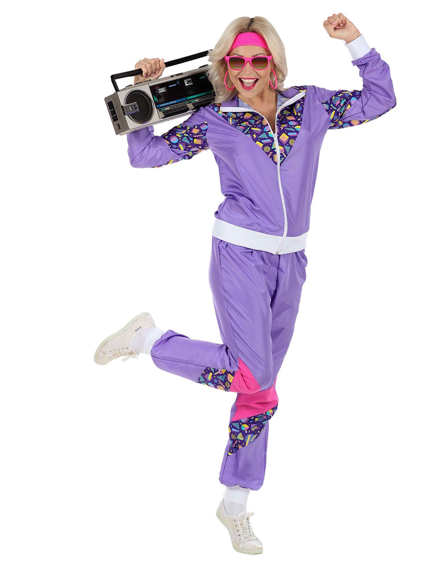Acest costum din anii 80 pentru femei este format dintr -o geacă și pantaloni (bandă, bucle, radio și pantofi care nu sunt incluse). Geaca de pistă este violet, cu panouri violet închis cu modele. Se închide cu un fermoar pe față. Partea de jos a sacoului și mânecile este mărginită de o fâșie largă de țesătură albă. Pantalonii potriviți sunt violet, cu o fâșie de țesătură modelată la genunchi și o fâșie de țesătură roz. Este listat în glezne. Acest costum retro va fi perfect pentru a participa la o seară de anii 80.