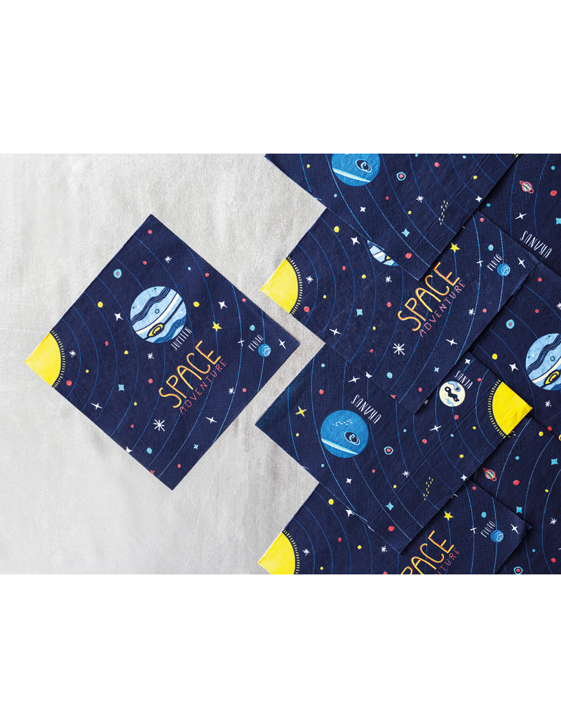 Acest lot este format din 20 de prosoape de hârtie. Sunt albastre cu stele și planete, precum și inscripția „aventură spațială”. Sunt pliate aproape 16,5 x 16,5 cm și 33 x 33 cm odată desfășurate. Aceste prosoape de unică folosință vor fi perfecte pentru o gustare de naștere a unui fan astronomie!