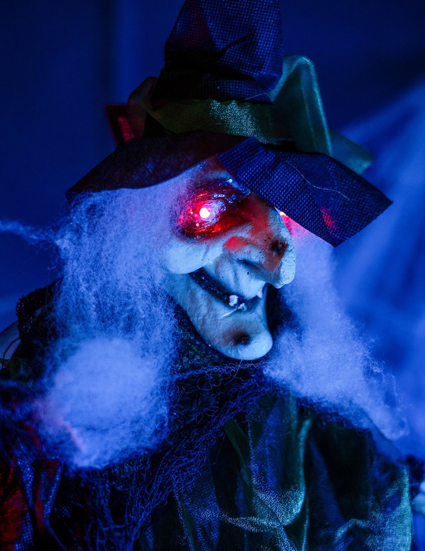 Această decorare măsoară trimis 110 cm. Ea reprezintă o vrăjitoare înspăimântătoare care se aprinde în întuneric. Această vrăjitoare are o pălărie și o culoare neagră și verde. Va fi perfect pentru decorarea camerei dvs. cu acest decor imens și înspăimântător în timpul Halloween -ului!
