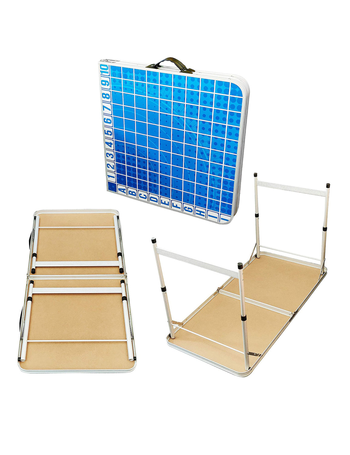 Acest tabel de fotografii de luptă măsoară aproximativ 120 cm înălțime, lățime de 60 cm, lungime de 190 cm. Masa este concepută pentru a juca bătălia navală cu trăgătorii, veți găsi o parte albastră și o grilă roșie, cu figuri și litere de abscare pentru a putea juca ușor! Această masă pliabilă va fi perfectă pentru toate serile tale cu prietenii, o poți lua peste tot!
