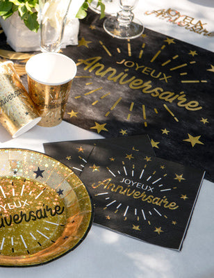 10 șervețele de hârtie negre și aurii cu mesajul „La mulți ani”, 33 x 33 cm cu stele
