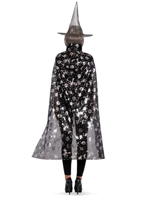 Setați pălăria de vrăjitoare și pelerina femeilor negre și argintii