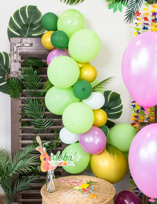 Inclus: 30 25 cm baloane, 38 13 cm baloane, 2 30 cm baloane, 4 foi tropicale, 1 bandă de autocolante adezive, 1 5 m bandă de atașare