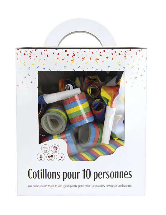 Inclus: 10 sarbacanes, 10 chapeaux, 10 sans gênes, 60 serpentins, 100 boules