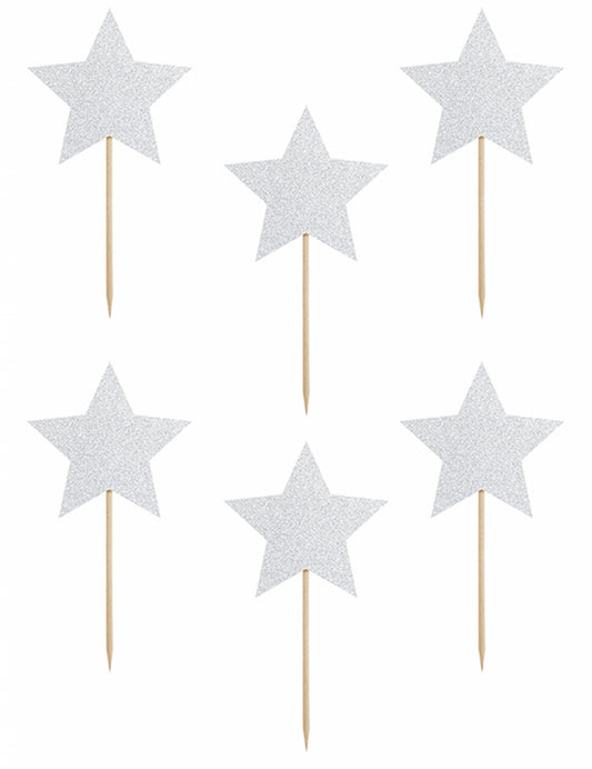 6 decoruri pentru tort cu steluțe argintii și sclipici pe stâlpi de 11,5 cm pentru ziua de naștere