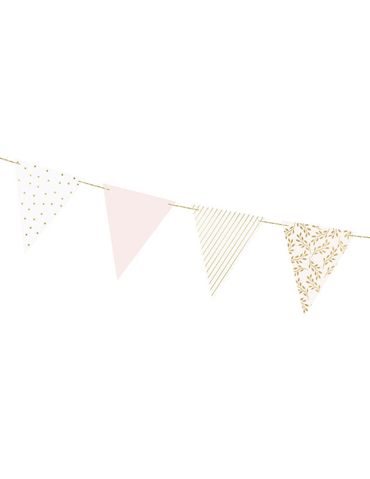 Ghirlandă cu fanioane din carton roz și alb 18 x 210 cm cu modele aurii