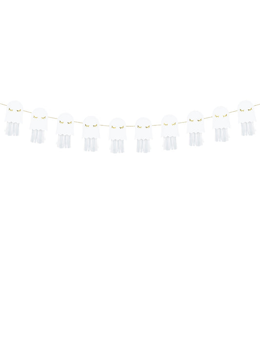 Ghirlandă de hârtie cu fantome albe și aurii, 1,3 m, necesită asamblare