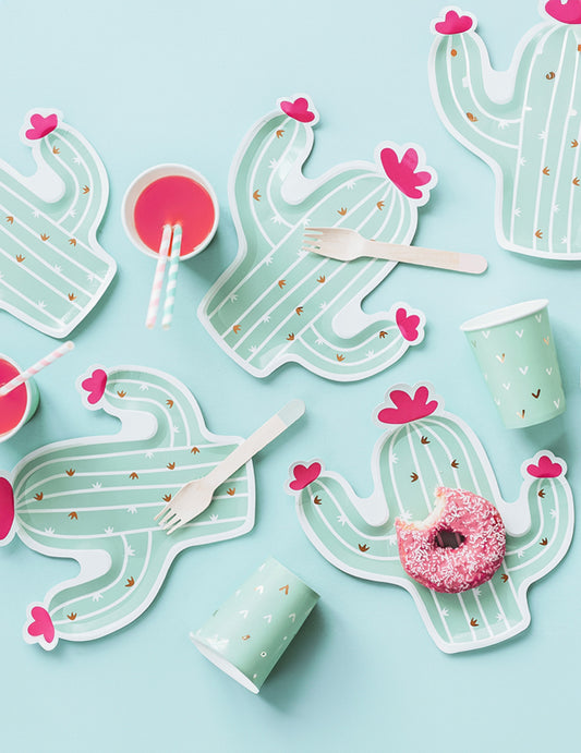 Epuizat6 farfurii de carton în formă de cactus, în culorile mentă, fuchsia și auriu, 23 x 24 cm