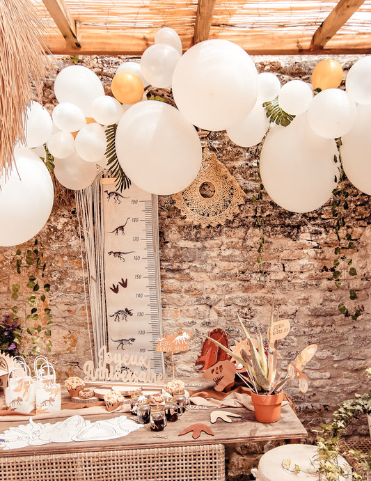Inclus : 5 Baloane a câte 45 cm, 30 de baloane a câte 25 cm , 20 de baloane a câte 12 cm , 4 frunze de Monstera , 3 frunze de palmier , 1 Ghirlandă de iederă , 1 panglică albă , 1 Panglică de plastic pentru arc , 20 de puncte de lipici