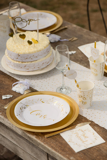 10 farfurii de carton „Just Married” din auriu alb și roz, 23 cm pentru o nuntă elegantă