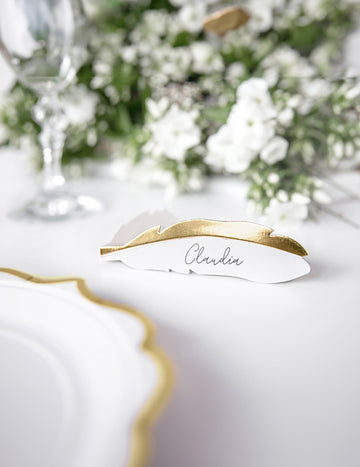 10 cartonașe de loc cu pene albe și aurii metalice, 26,6 x 7,6 cm cm pentru nuntă