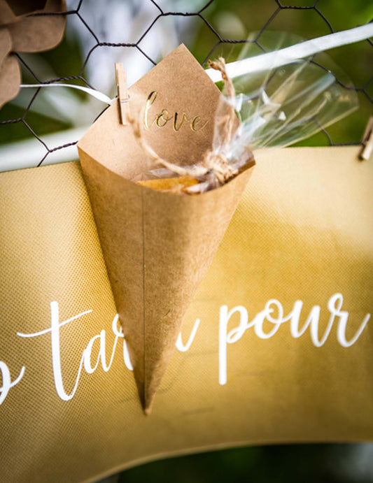 Epuizat10 conuri din hârtie kraft cu litere aurii în relief, design „dragoste”, 20 x 11 cm pentru nuntă