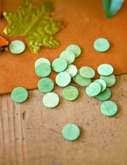 24 confetti mici rotunde verzi din lemn pentru masă 1.2 cm