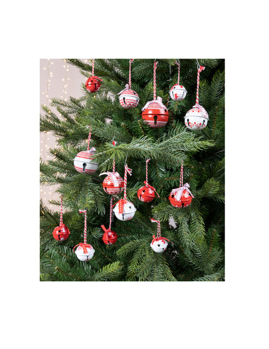 Epuizat14 ornamente de Crăciun cu clopoței albi și roșii (mărimi de la 4 la 6) cm cu noduri