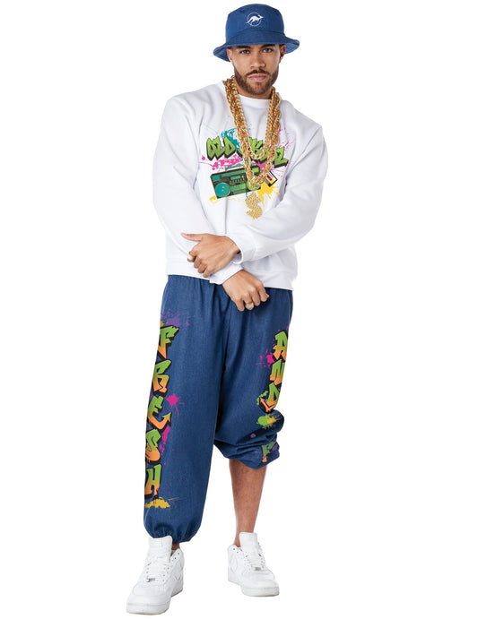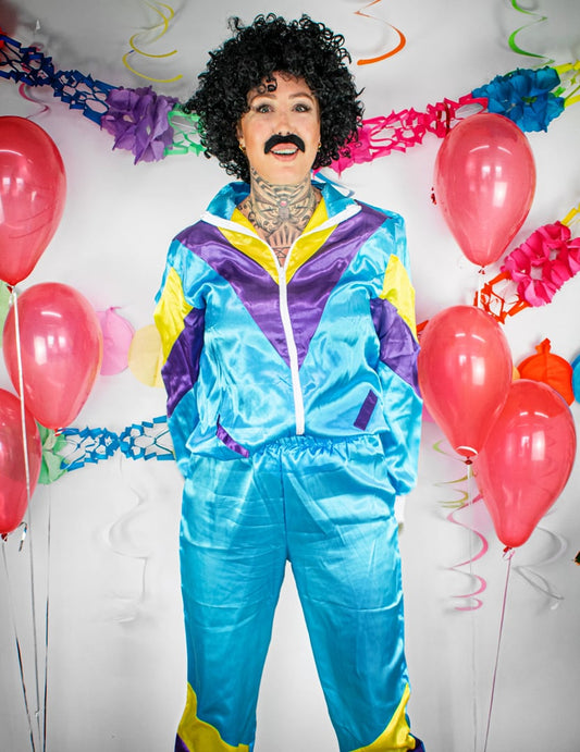 Pentru bărbați, un trening colorat este o piesă cheie pentru un costum sportiv din anii 80 Optează pentru culori strălucitoare precum roz, verde sau albastru. Modelele cu imprimeuri precum dungi, modele geometrice sau logo-uri supradimensionate erau foarte populare la acea vreme. Pentru a-ți completa ținuta, ia în considerare o pereche de adidași retro. Modelele din piele albă cu note de culoare sunt o alegere sigură. Pentru a adăuga o notă de autenticitate look-ului tău, nu uita de accesoriile emblematice ale epocii, cum ar fi o șapcă de baseball purtată pe spate sau un rucsac. În fine, pentru un look cu adevărat îndrăzneț, poți opta pentru o mustață falsă, foarte la modă în anii 80.