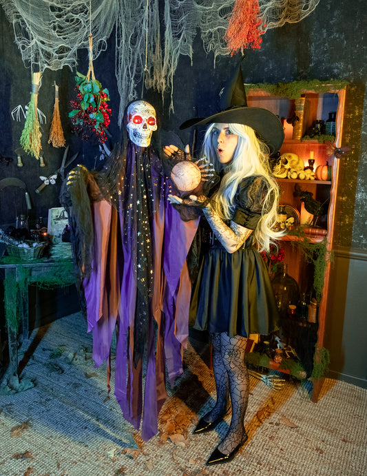 Inclus: 1 rochie cu glugă, 1 colier de schelet, 1 curea, 1 mască