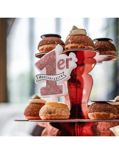 Bougie 1er anniversaire paillettes rose gold 10 x 8 cm avec bobèche pour gâteau