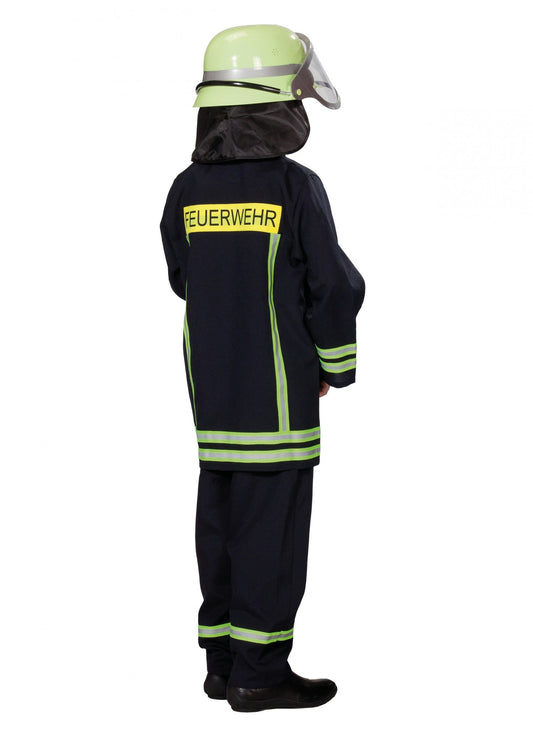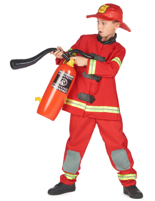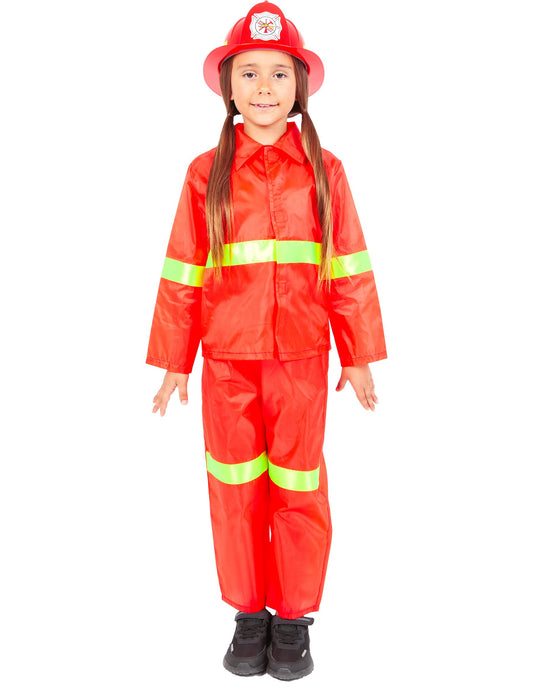 Costumul poate include o jachetă roșu aprins, ușor de spălat, cu dungi reflectorizante pentru un plus de realism. Unele modele oferă și o cască de pompier și diverse accesorii precum un stingător de jucărie sau un difuzor pentru a da mai multă credibilitate jocului de rol.