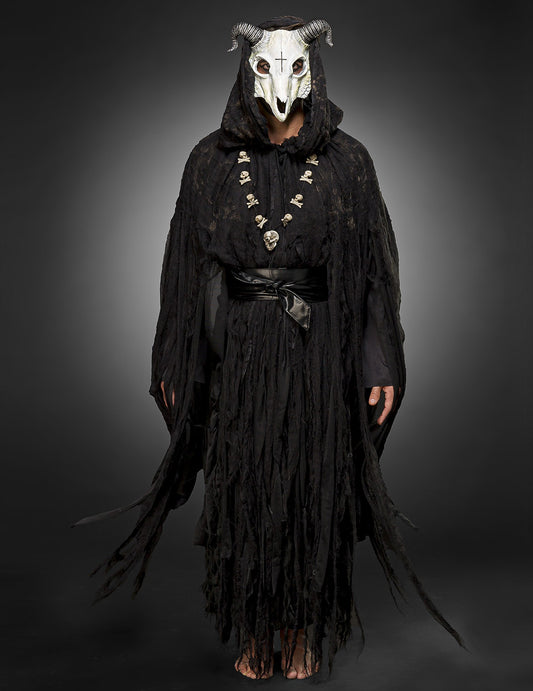 Inclus: 1 rochie cu glugă, 1 colier de schelet, 1 curea, 1 mască