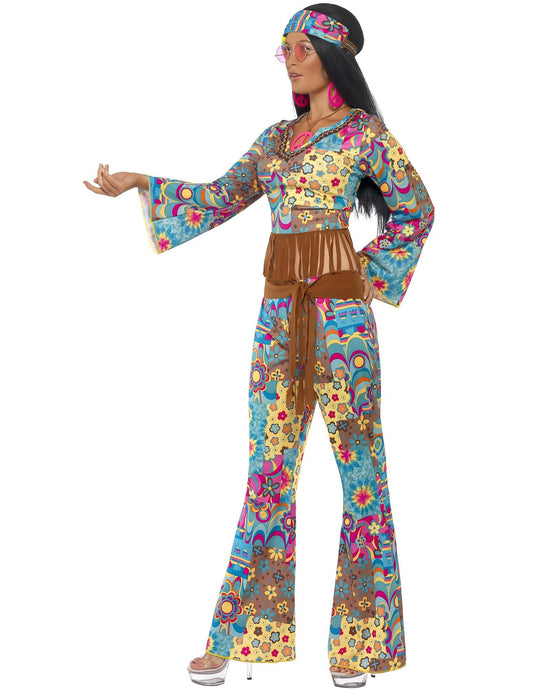 Costumul hippie pentru femei este un clasic care nu se demodează niciodată. Simbol al erei hippie și al mișcării „pace și dragoste”, acest costum este ideal pentru a retrăi atmosfera psihedelică a anilor 60 și 70 Costumul include în general o ținută colorată și înflorată, cu top sau tunică cu franjuri și fund sau clopot. pantaloni cu fundul clopot. Modelele florale, culorile luminoase și materiale precum catifeaua sunt adesea folosite pentru a recrea stilul epocii.