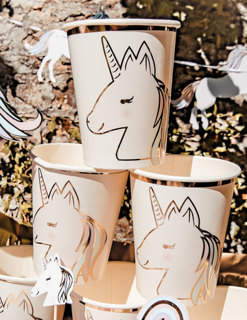 8 assiettes en carton licorne pastel et or 23 cm forme tête