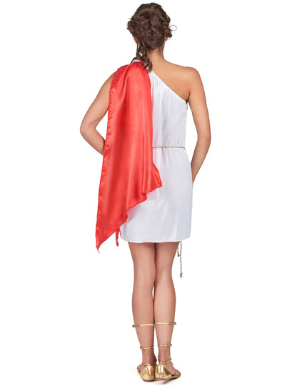 Acest costum al zeiței romane pentru femei este format dintr -o rochie cu o pelerină roșie pe partea dreaptă, un banner și o centură (inel și pantofi nu sunt incluse). Partea de jos și partea de sus a rochiei sunt decorate cu o bandă neagră cu modele aurii. Bannerul și centura sunt împletite cu frânghie albă și aur. Acest costum al zeiței romane este perfect pentru a vă deghiza ziua unui spectacol, pentru un carnaval sau pentru o seară deghizată.
