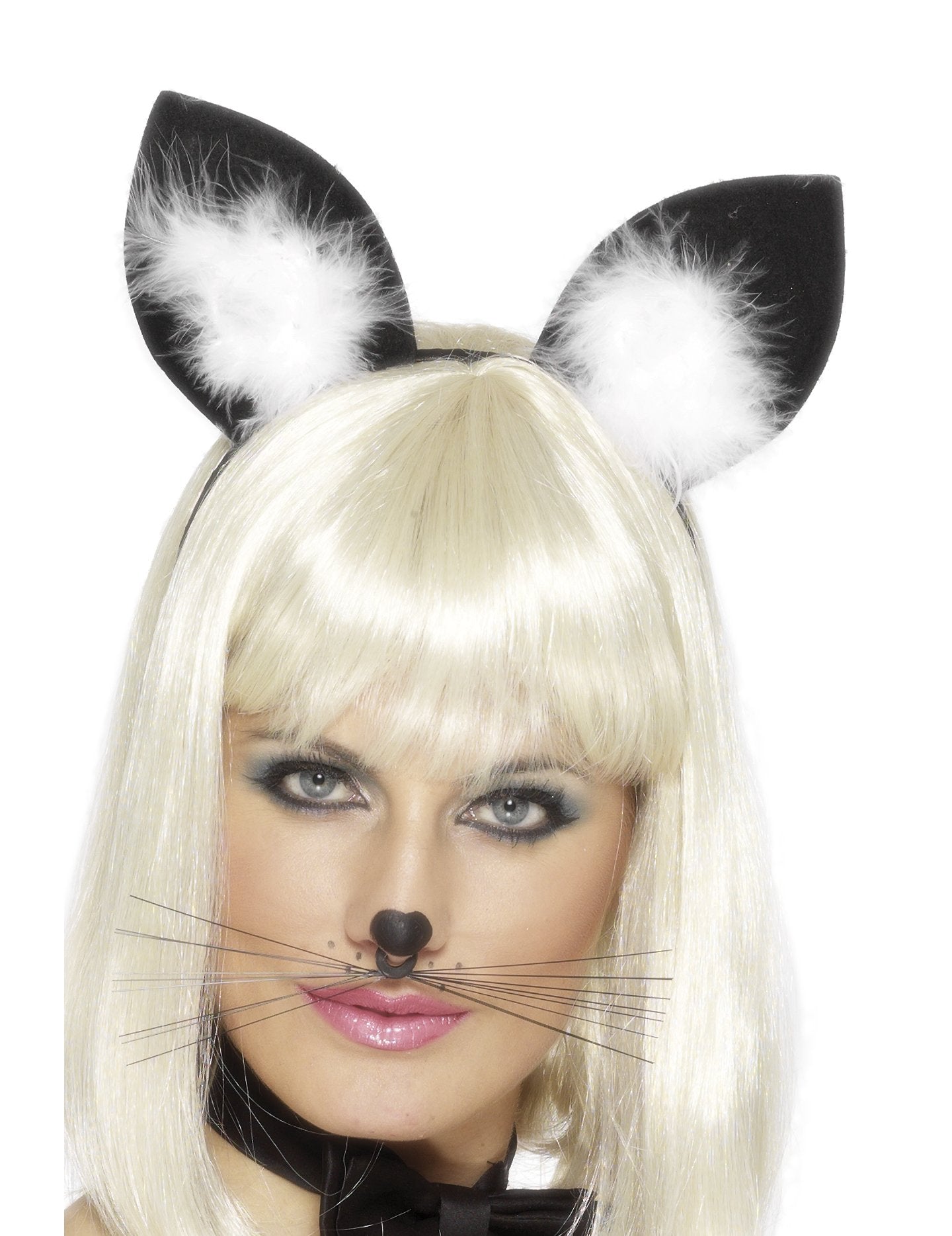 Această bandă neagră are urechi mari de pisică. Este decorat cu pene albe. Este accesoriul ideal pentru a completa un costum de pisică pentru carnaval.