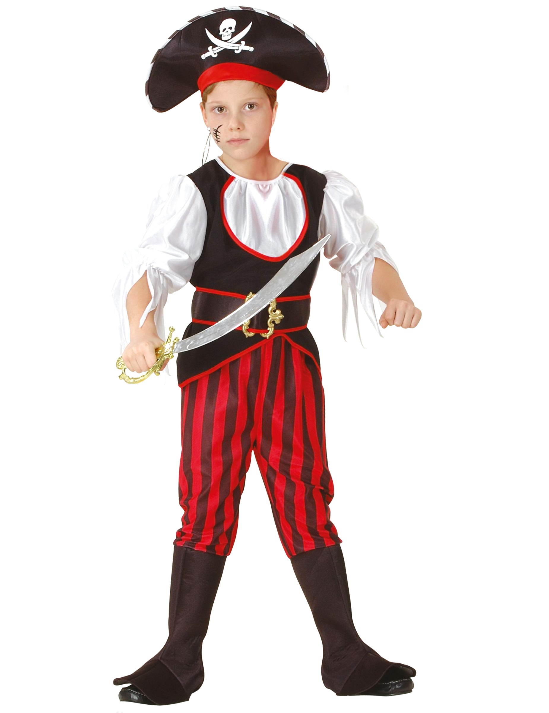 Această deghizare a piratului pentru băiat este formată dintr -un top negru cu bordură roșie, mâneci și culturi din satin. Ținuta include, de asemenea, pantaloni elastici cu dungi negre și roșii, cu Sur-Boots integrate, o centură cu o buclă de zgârietură aurie, precum și o pălărie mică pe care este imprimată un craniu (sabia și pantofii nu sunt incluse). Acest costum este ideal pentru carnaval, un spectacol sau orice alt eveniment deghizat.