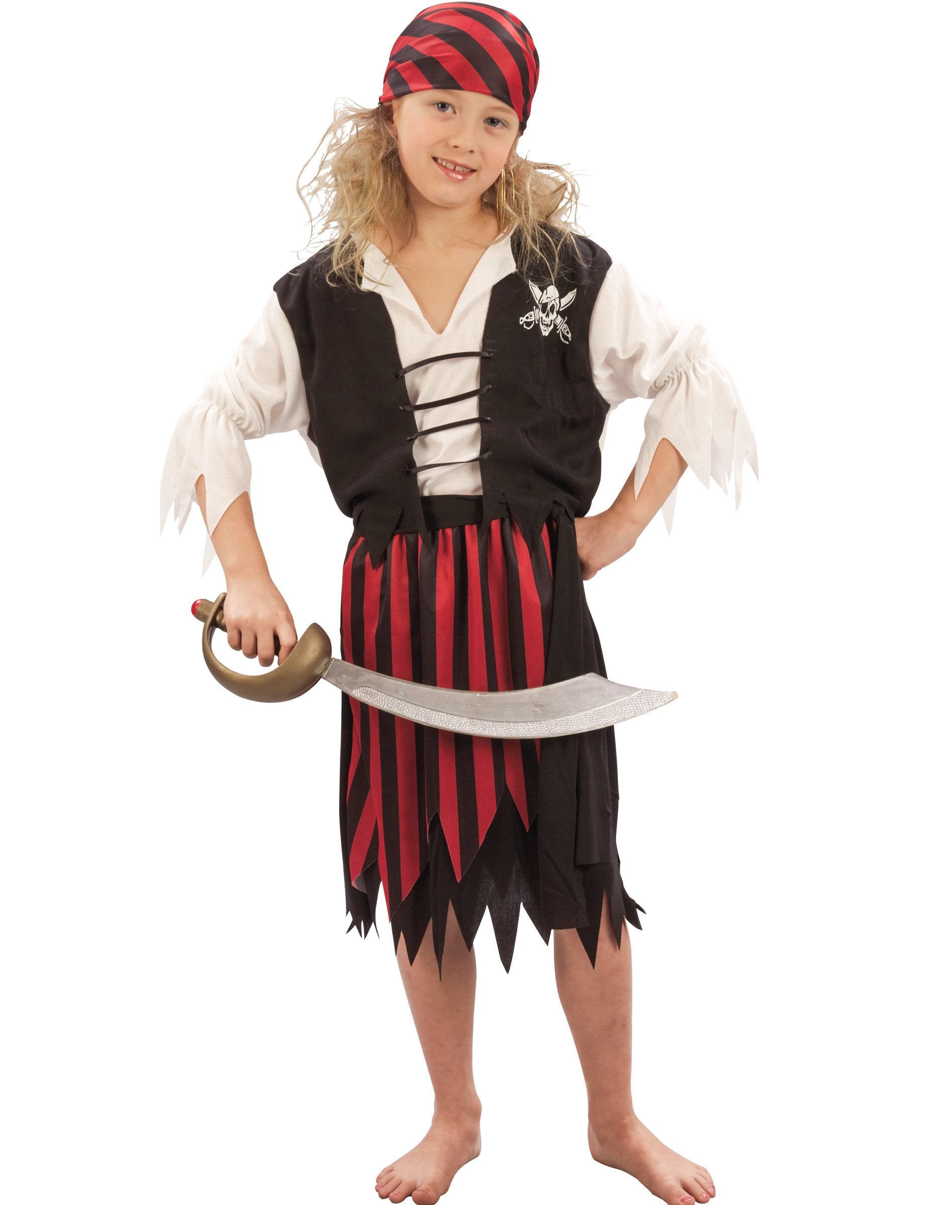 Această deghizare pirat pentru fată este formată dintr -o cămașă albă mare, cu mâneci serrate 3/4 și vestă neagră integrată. Un craniu alb este tipărit pe partea stângă a pieptului și gulerul este împărțit (sabia nu este inclusă). O fustă cu dungi roșii și negre, o bandană potrivită, precum și o centură neagră completează acest costum, care va fi ideal pentru carnaval, un spectacol sau orice alt eveniment deghizat.