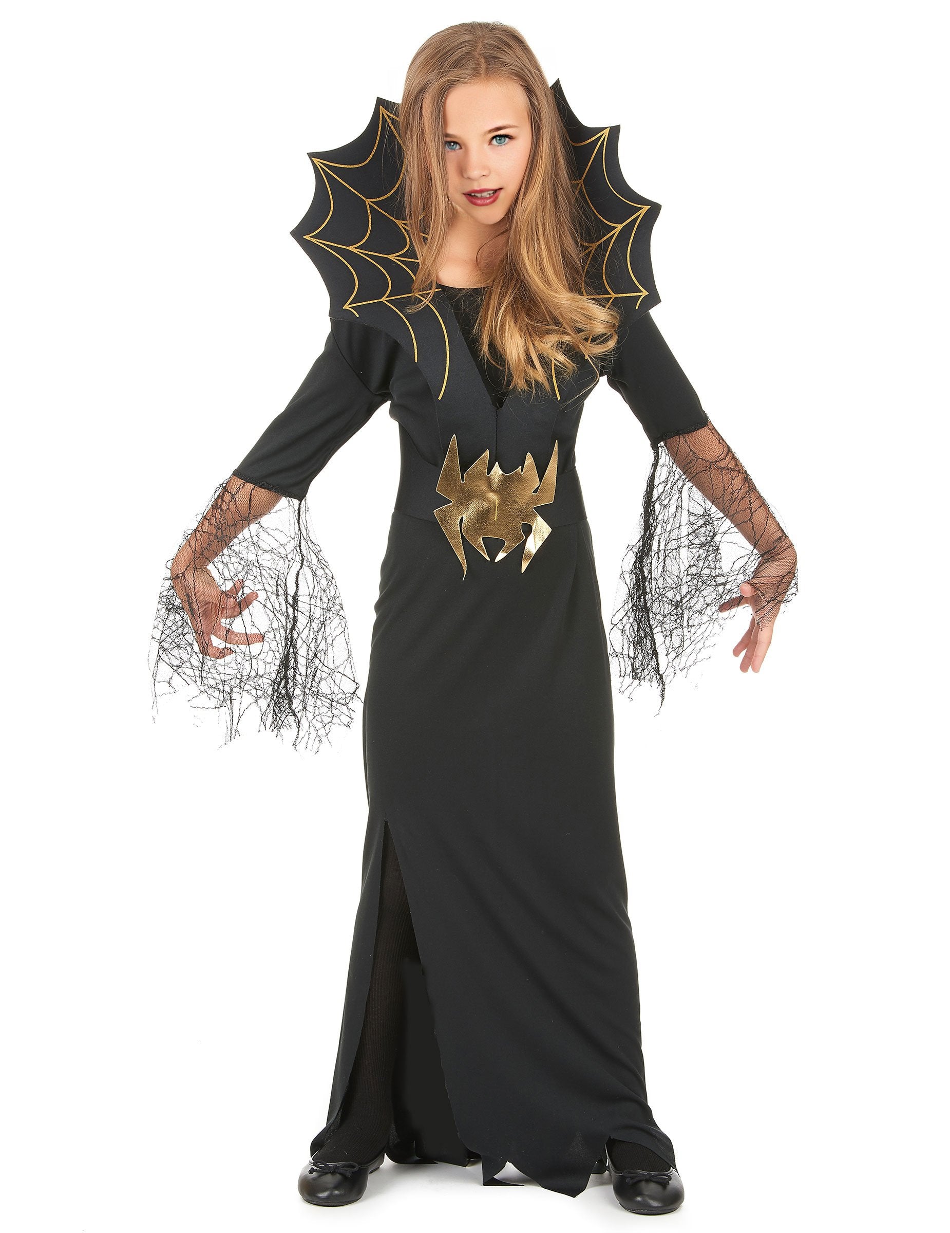 Această fetiță deghizată cu vrăjitoare păianjen este formată dintr -o rochie și o centură cu guler. Rochia lungă neagră are o tăietură teșită pe fund. Este decorat cu pânze transparente negre, cu păianjeni de păianjeni la capătul mânecilor. Centura neagră este decorată cu un păianjen mare auriu și este cusută la un guler mare de pânză de păianjen. Centura și gulerul este format din spumă flexibilă. Acest costum de vrăjitoare pentru fată va fi ideal pentru seara de Halloween sau cu ocazia oricărei alte teme de deghizate.