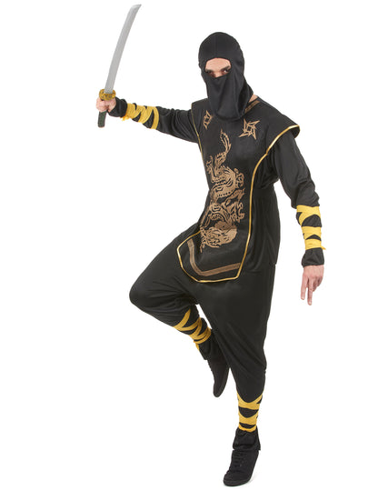 Costum de aur ninja pentru bărbați compus din pantaloni, un top cu plastron și o capotă. Pantalonii, partea de sus și capota sunt negre într -un material flexibil și extensibil, ceea ce va permite cât mai mulți oameni. Plastronul, fixat pe partea de sus, este negru cu modele de ninja auriu este într -un simțit ușor gros pentru a da o ținută pe bust (arma care nu este inclusă). Benzile de țesut galben vor fi legate cu antebrațele și viței. Această ținută ninja este perfectă pentru serile tale tematice, pentru un spectacol, pentru carnaval sau pentru orice alt eveniment deghizat.