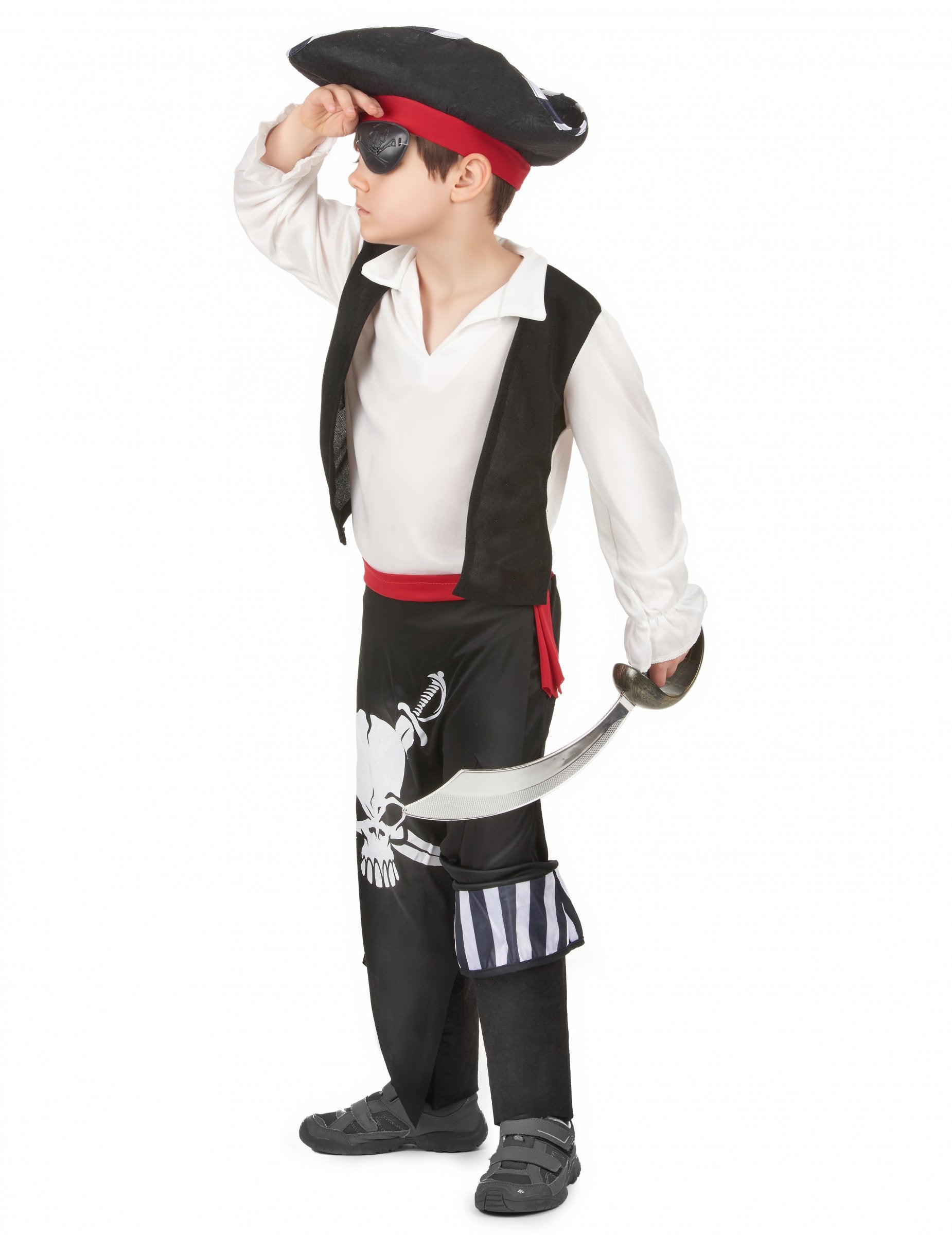 Această deghizare a piratului pentru băiat este formată din pantaloni elastici cu centură roșie integrată și șorț șters decorat cu un craniu. Chirurgia cu dungi negre și negre și negre sunt cusute direct cu pantaloni. Ținuta include, de asemenea, o vestă cusută pe o cămașă albă falsă, cu mâneci ușor pufoase. O pălărie cu bandă roșie integrată, precum și o pereche de surf-boot-uri cu efect de pâslă completează, de asemenea, această panoplie. Această deghizare pirat va fi perfectă pentru a întruchipa un adevărat pirat în timpul unei gustări de naștere, a unui carnaval sau a unui spectacol.