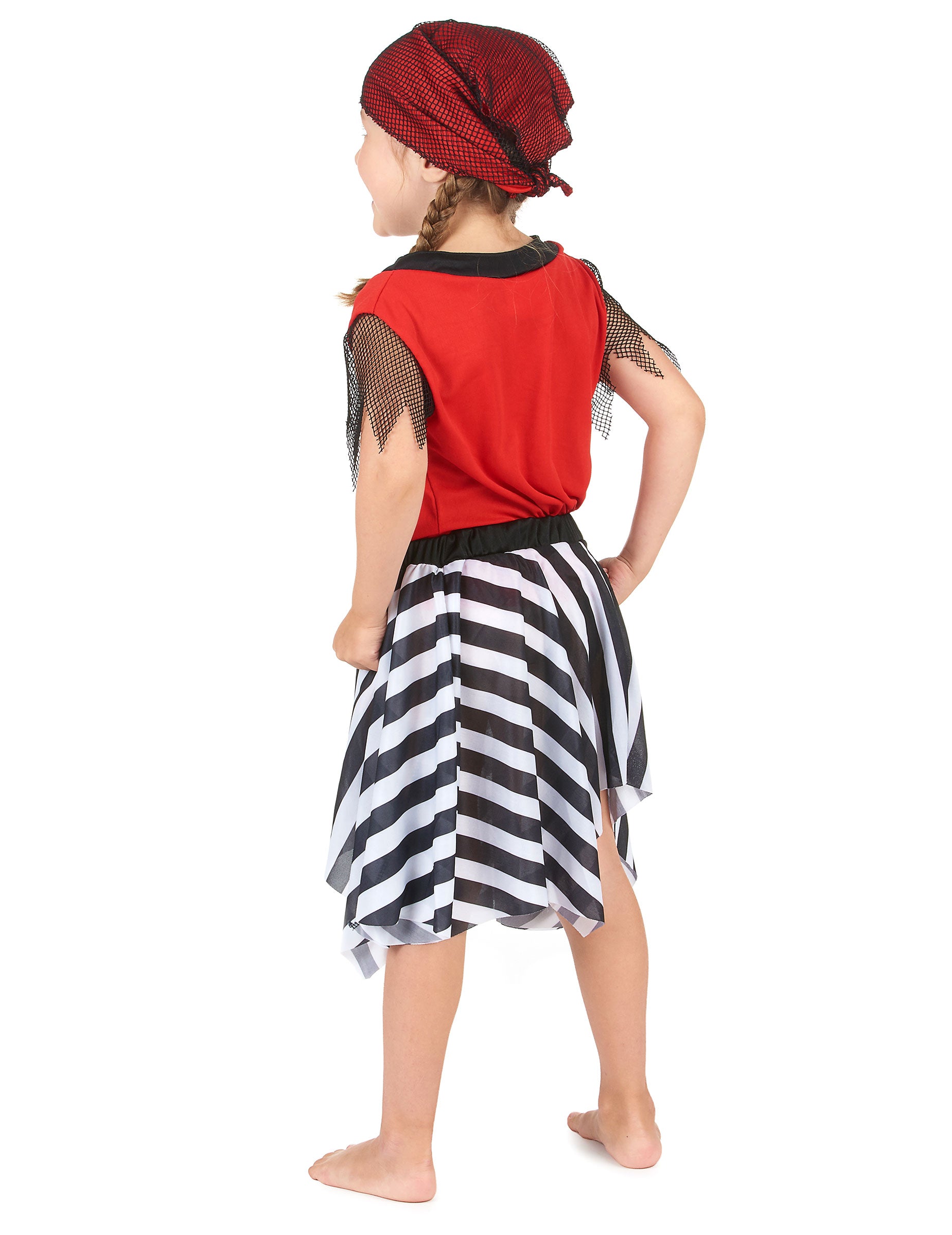Această deghizare a piratului pentru fată este formată dintr -o tunică roșie și neagră, cu un craniu alb alocat pe față și mâneci scurte în țesut seruit. Ținuta include, de asemenea, o fustă cu dungi elastice alb -negru la talie, precum și o șapcă potrivită (sabia nu este inclusă). Acest costum va fi ideal pentru carnaval, un spectacol sau orice alt eveniment deghizat.