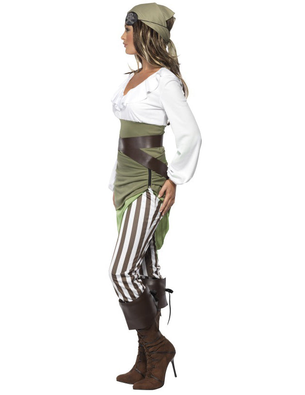 Această deghizare sexy pirat pentru femei este formată dintr -o bluză, o fustă, jambiere, o bandană și o pereche de cizme (cache, sabre și cizme care nu sunt incluse). Bluza lungă -nedumerită este bej cu un gât destul de zburător. Fusta este bej/maro, cu un volan verde deschis pe fund. O dungi albe rupte și maro completează acest set. În cele din urmă, este inclusă o bandană verde, care se potrivește cu fusta. Trebuie să fie legat în jurul capului. Cizmele pentru a se lega datorită șirepelor pentru un efect rulat, precum și o centură maro vin pentru a accesoriza acest costum pirat. Acest costum pirat este ideal pentru a vă evidenția în timpul unei seri deghizate pe tema pirateriei. El va putea să vă proiecteze în universul pirațiilor, combinând feminitatea și eleganța cu această lume plină de pericole.