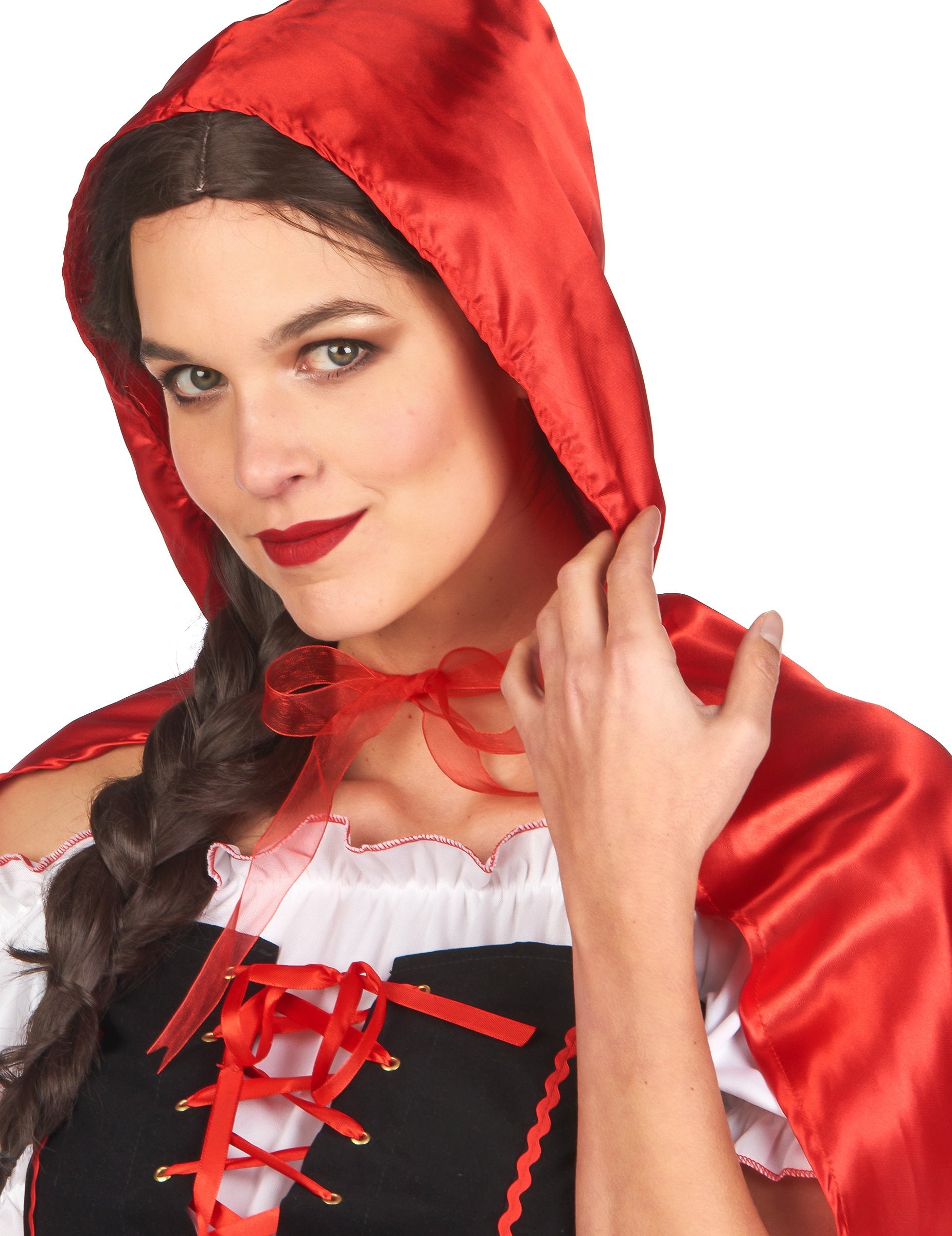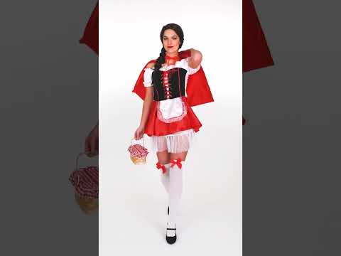 Această deghizare roșie a lui Chaperon include o rochie, o pelerină și o petticoat fin. Rochia are mâneci pufoase albe și un corset negru la bust. De asemenea, are o fustă roșie lungime de 33 cm, cu un șorț alb integrat. O pelerină cu glugă, precum și o petticoat elastic vor veni pentru a da volum ținutei tale. (Ciorapi, încălțăminte și coșuri nu sunt incluse). Acest costum este perfect pentru a întruchipa o plimbare roșie în ziua carnavalului sau pentru o seară deghizată.
