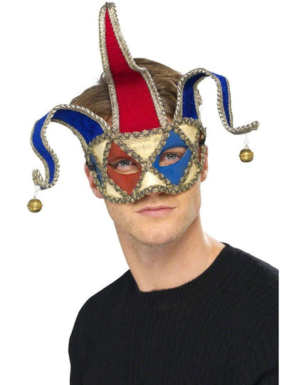 Această mască de jester venețiană acoperă fața superioară și se atașează în spatele a 2 șirurilor negre de 1 cm lățime. Finisajele sunt precise, o împletitură este lipită de toate contururile măștii și 3 file accentuează spiritul bufon al accesoriului. Aceste 3 file sunt un fel de catifea, sunt modelabile și 3 clopote atârnă la sfârșit pentru a face zgomot. Această mască este ideală pentru reproducerea unei deghizări demne de cei mai mari carnavatori din lume.