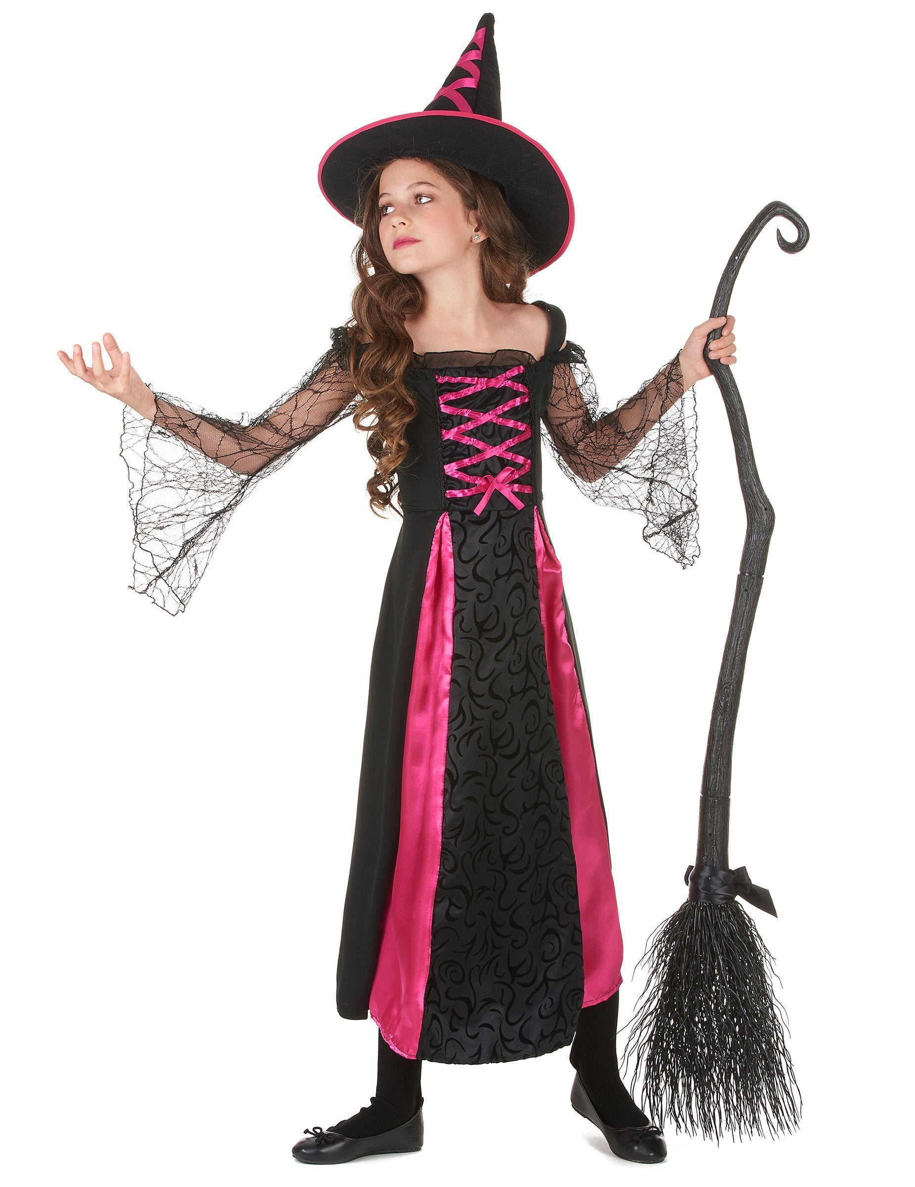 Această deghizare de vrăjitoare de Halloween pentru fete este formată dintr -o rochie și o pălărie. Rochia este neagră și roz, cu mâneci evazate în dantelă, cu modele de păianjen, partea din spate, iar partea superioară a rochiei sunt în catifea de imitație. Partea frontală are un efect de corset cu panglică roz. Pălăria este neagră și roz, care se potrivește întregului (pantofi, colanți și mături nu sunt incluse). Acest costum va fi ideal pentru aruncarea vrăjilor în seara de Halloween.