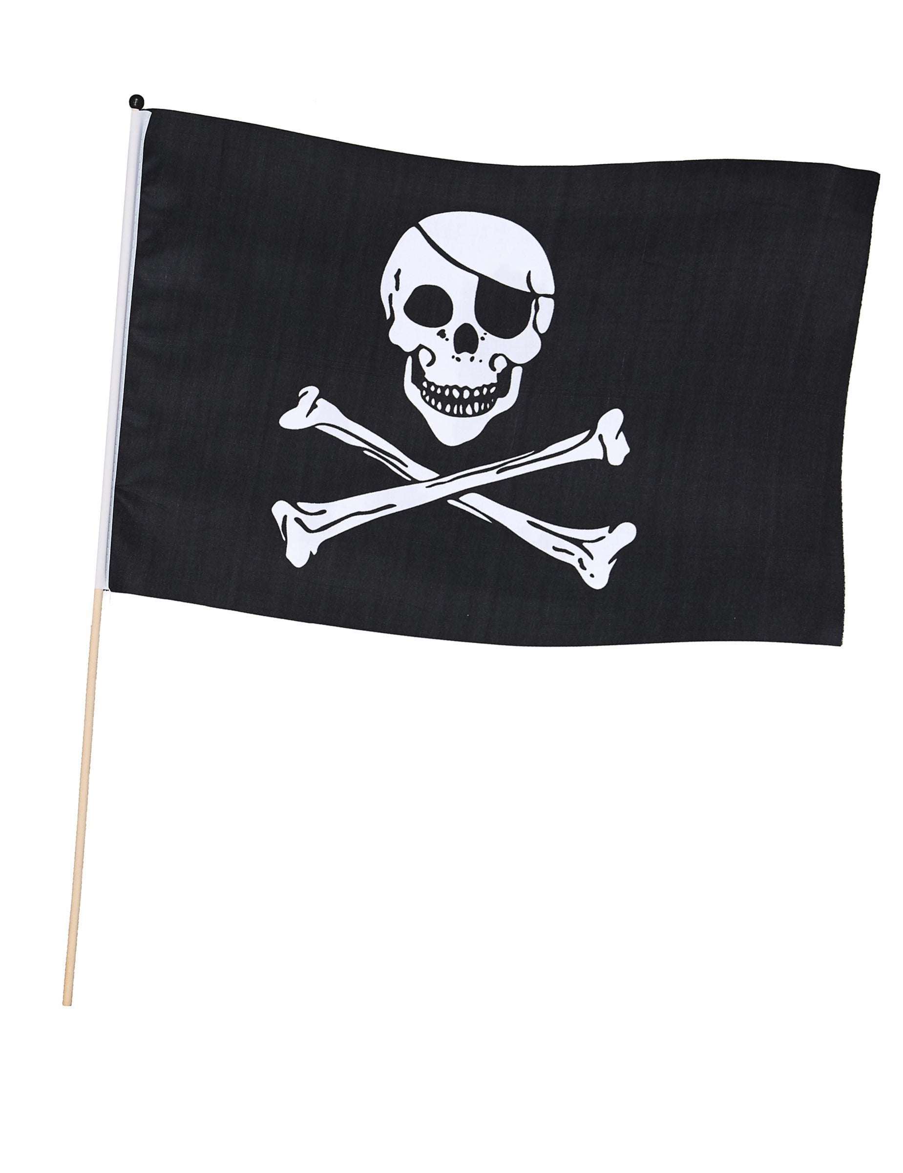 Acest steag pirat alb -negru măsoară 45 x 30 cm și are o tijă lungă de lemn de aproximativ 75 cm. Va fi ideal pentru decorarea interiorului pentru o seară tematică.