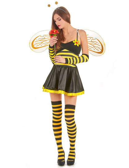 Această deghizare a albinelor pentru femei este formată dintr -o rochie scurtă, o bandă de cap, o pereche de aripi și o pereche de manșete potrivite (flori, ciorapi și încălțăminte nu sunt incluse). Rochia cu efect de satin negru cu curele subțiri are elastic în spate pentru a facilita utilizarea acesteia. Perechea de aripi galbene cu sclipici aurii se va repara pe spate folosind două elastice. O bandă cu antene completează deghizarea. Acest set este ideal pentru a întruchipa o albină în timpul unui eveniment deghizat sau tematic.