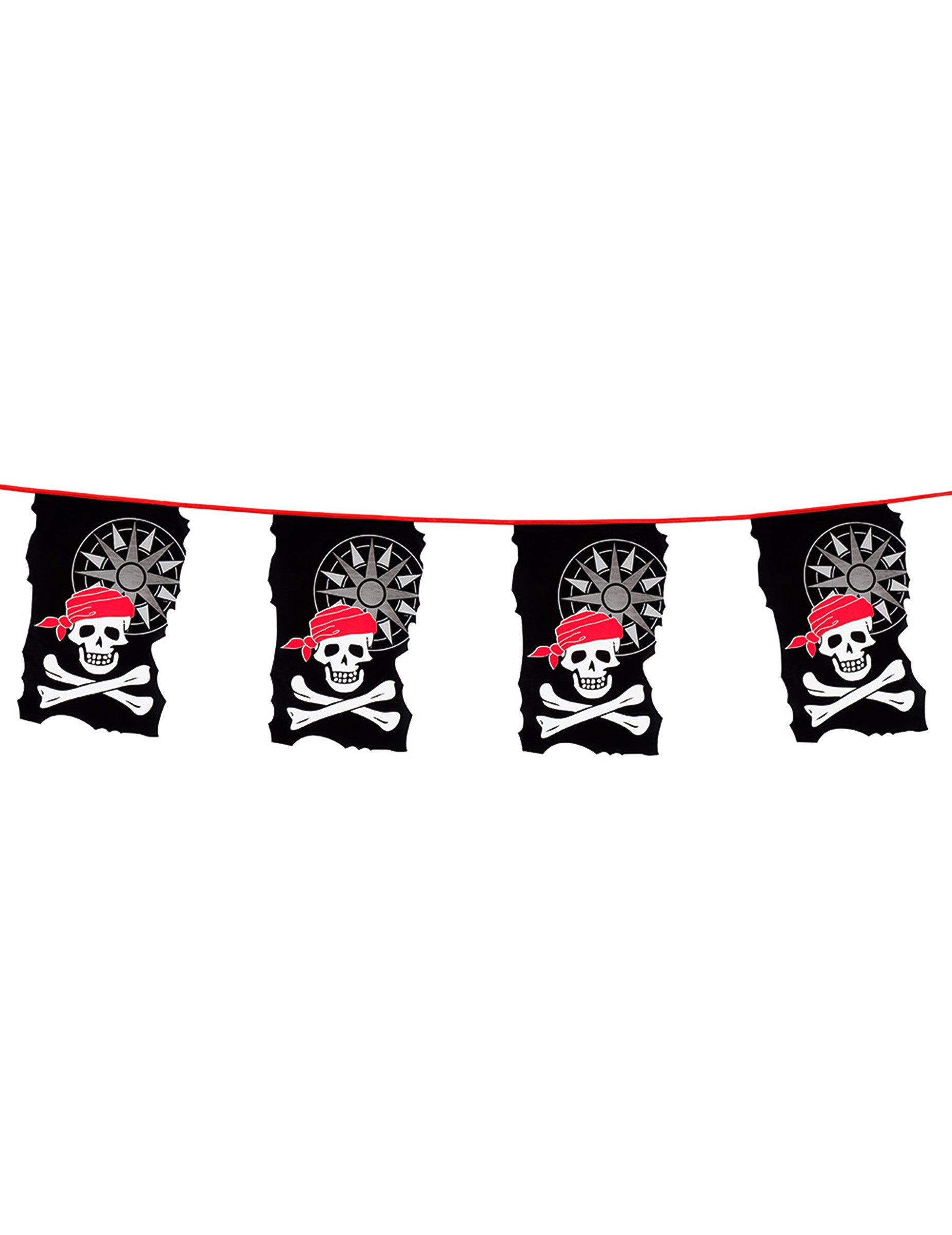 Această ghirlandă de plastic, lungime de 10 metri, este formată din mai multe bănuți de craniu imprimat. Fiecare pennant dreptunghiular măsoară aproximativ 35 x 22 cm. Acest element este ideal pentru decorarea camerei dvs. în timpul unui eveniment tematic pirat.