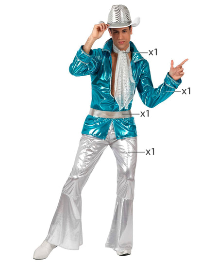 Această deghizare a discotecii pentru bărbați este formată dintr -un înalt, pantaloni, o centură și o eșarfă (pălărie și pantofi nu sunt incluse). Sus cu mâneci lungi și culoare albastră strălucitoare. Este deschis pe față și are un guler de cămașă. Pantalonii gri argintii au picioare de elefant. Elastic la talie, se va adapta cu ușurință morfologiei tale. O centură gri, precum și o eșarfă vor veni pentru a accesoriza acest set genial. Acest costum va fi perfect pentru a retrăi febra sâmbătă seara pentru o seară de discotecă.
