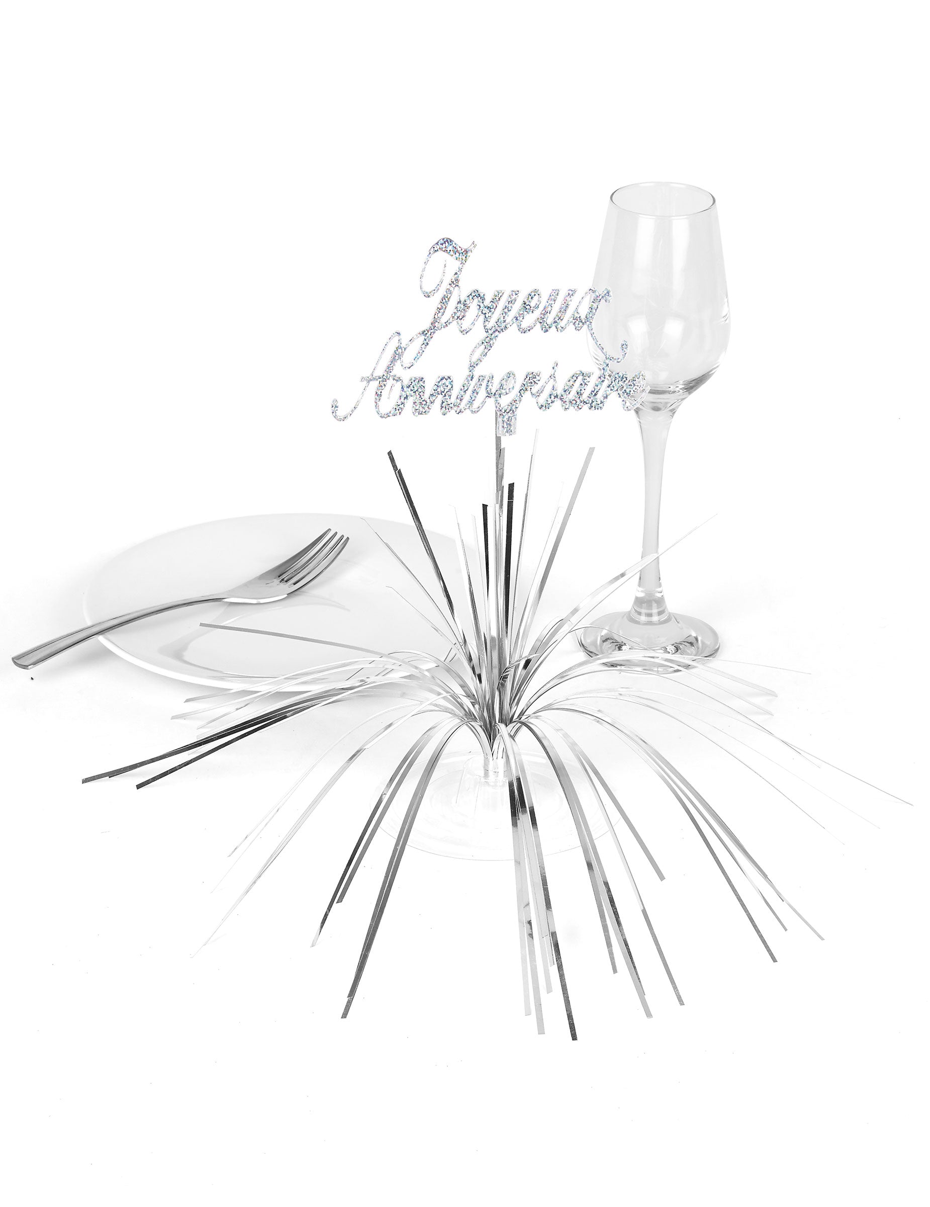 Acest centru de masă de argint măsoară aproximativ 27 cm înălțime. Este format dintr -un picior de plastic transparent pe care se adaugă o cacadă de argint, precum și inscripția „La mulți ani”. Acest decor va fi perfect pentru a -ți îmbrăca masa cu ocazia unei zile de naștere.