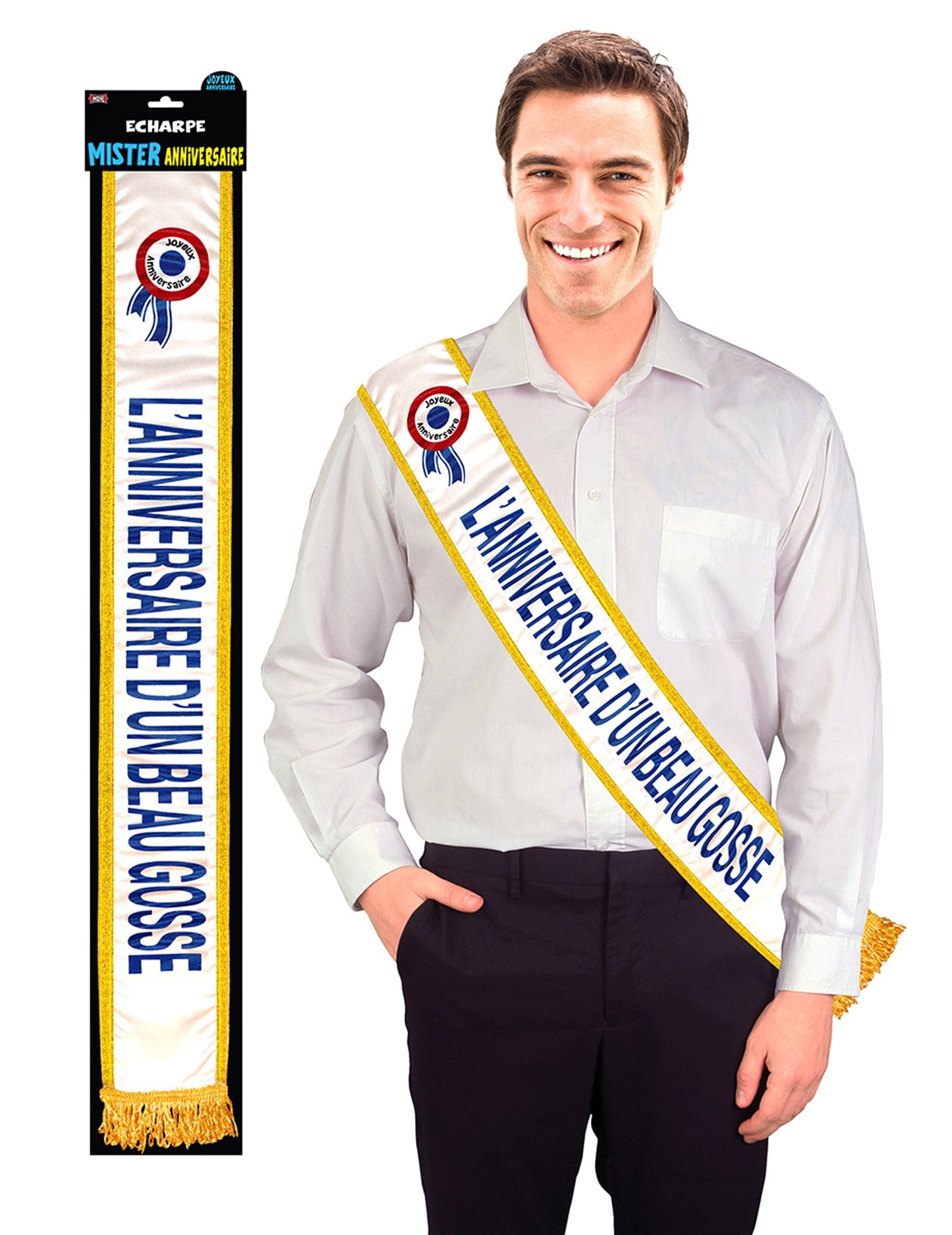 Această eșarfă pentru bărbați este formată dintr -o țesătură albă cu margini aurii și inscripția „aniversarea unui copil frumos” în albastru paletat. Eșarfa măsoară aproximativ 184 cm lungime. Va fi perfect pentru o petrecere de naștere.