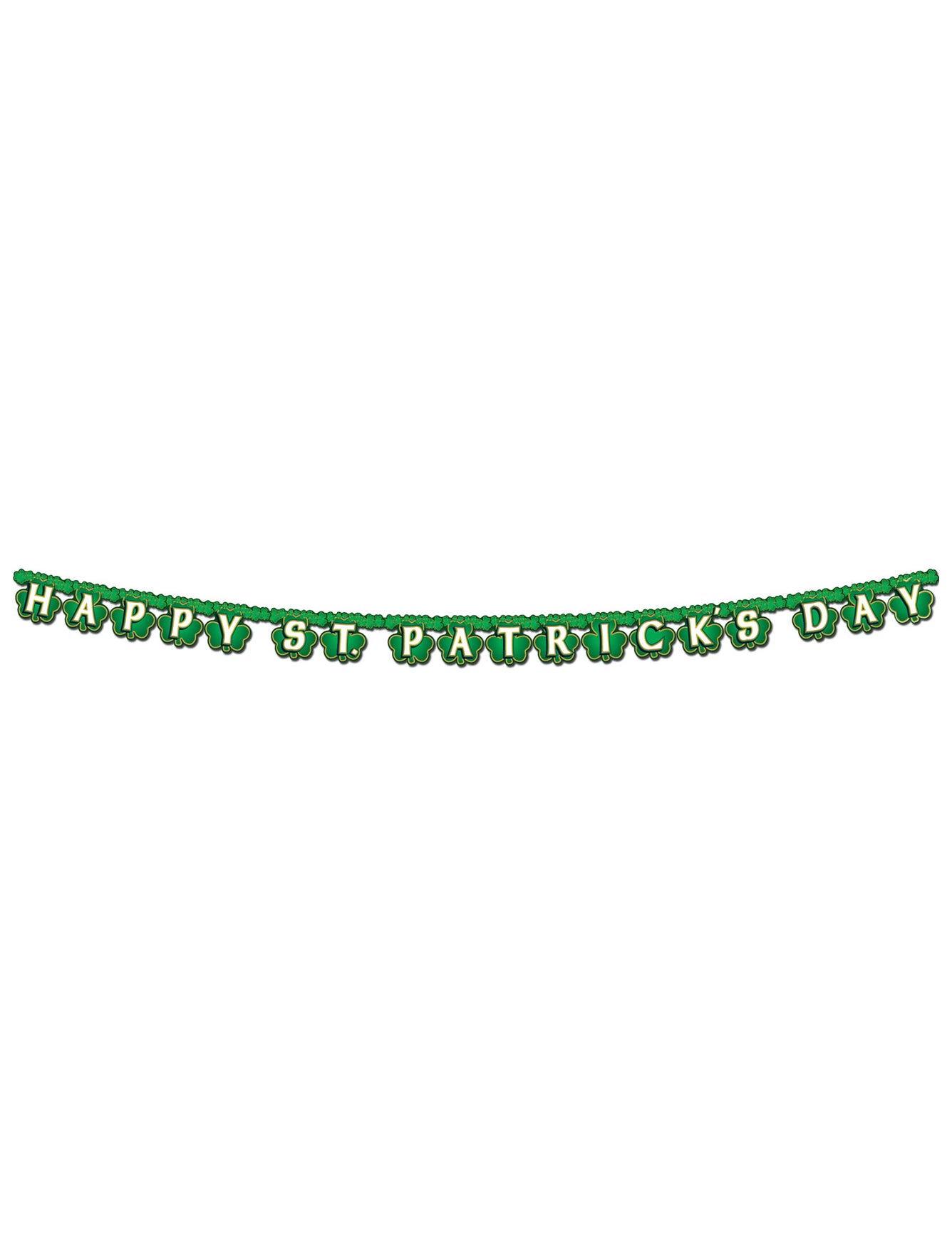 Ghirlanda de culoare verde cu inscripția „Happy St. Patrick's Day”. Fiecare scrisoare albă este într -un trifoi verde. Această decorare măsoară 2,1 m x 10,8 cm și va fi perfectă pentru decorarea camerei tale în timpul celebrei petreceri irlandeze.